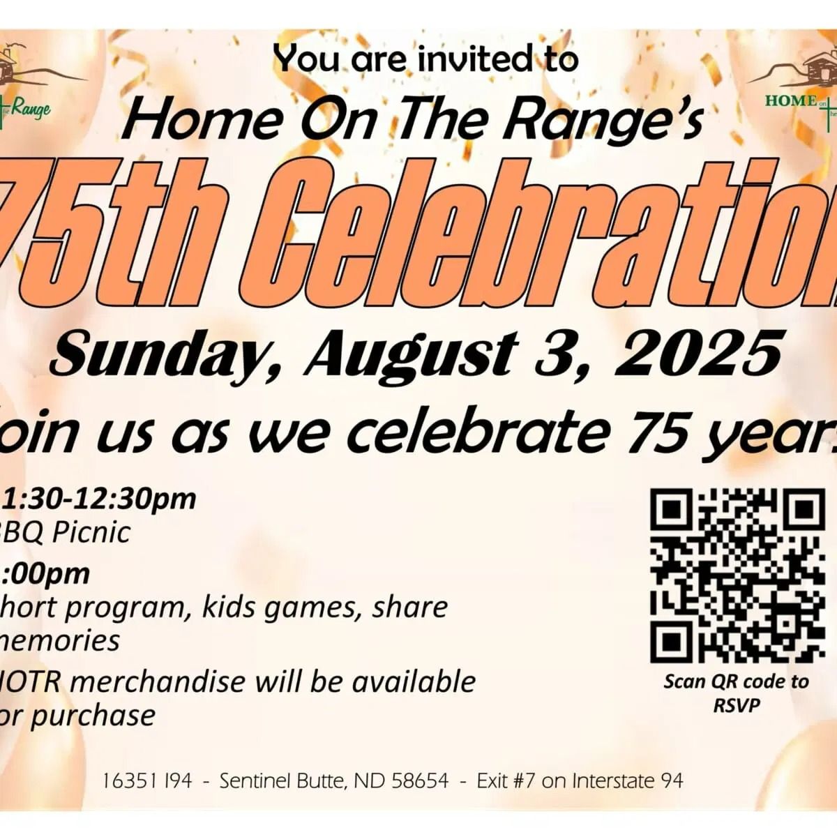 Come join us as we celebrate 75 years of Home On The Range with a fun-filled event filled with music, games, and delicious food! 11:30am – 12:30pm: Picnic Lunch1:00pm: Short program, kids games, sharing memories. Let’s make memories that’ll last another 75 years! See y’all there! Please RSVP by reserving tickets for