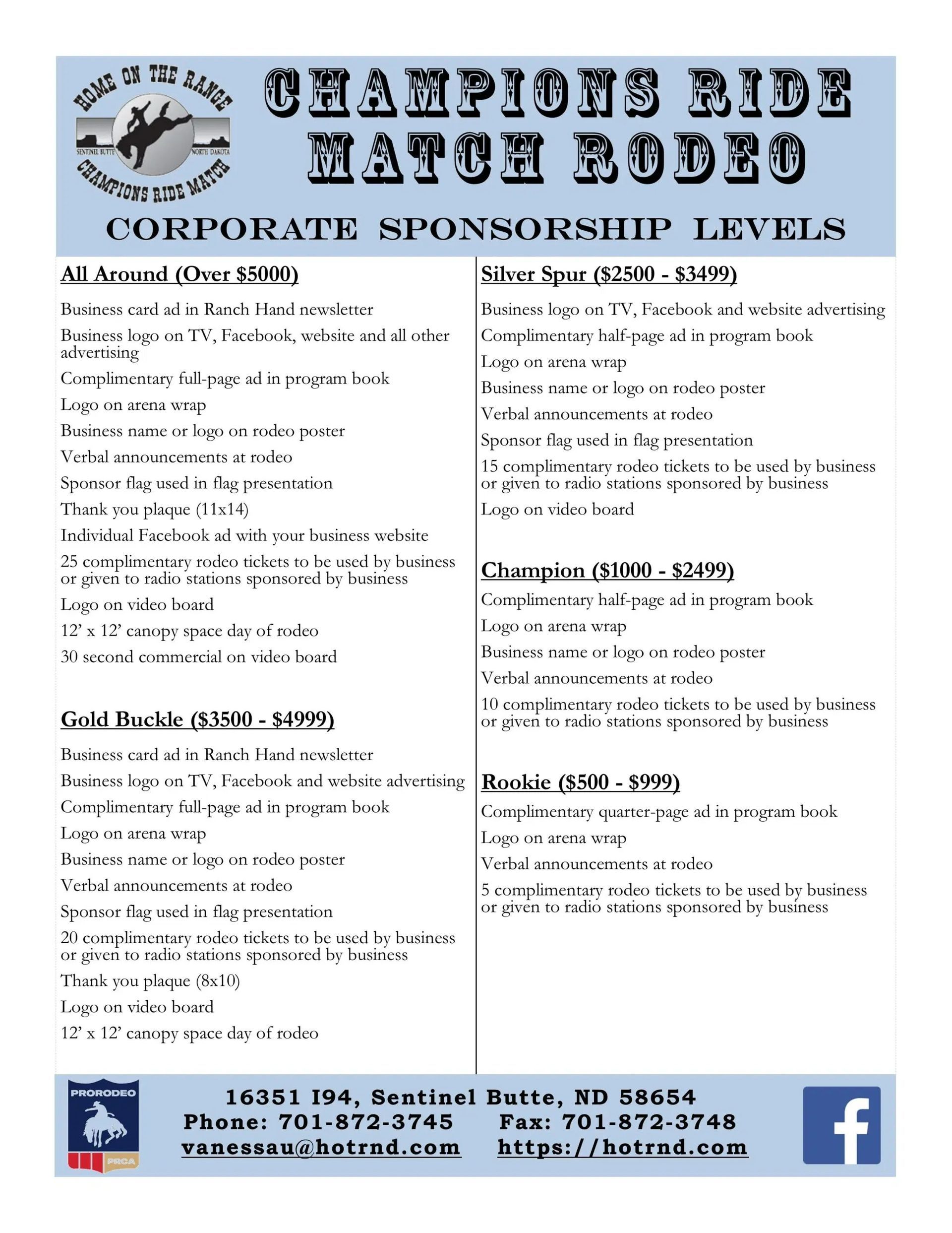 The following levels of corporate sponsorships are available for the Champions Ride. If interested, please contact Jolene (joleneo@hotrnd.com) or Vanessa (vanessau@hotrnd.com) at 701-872-3745.
